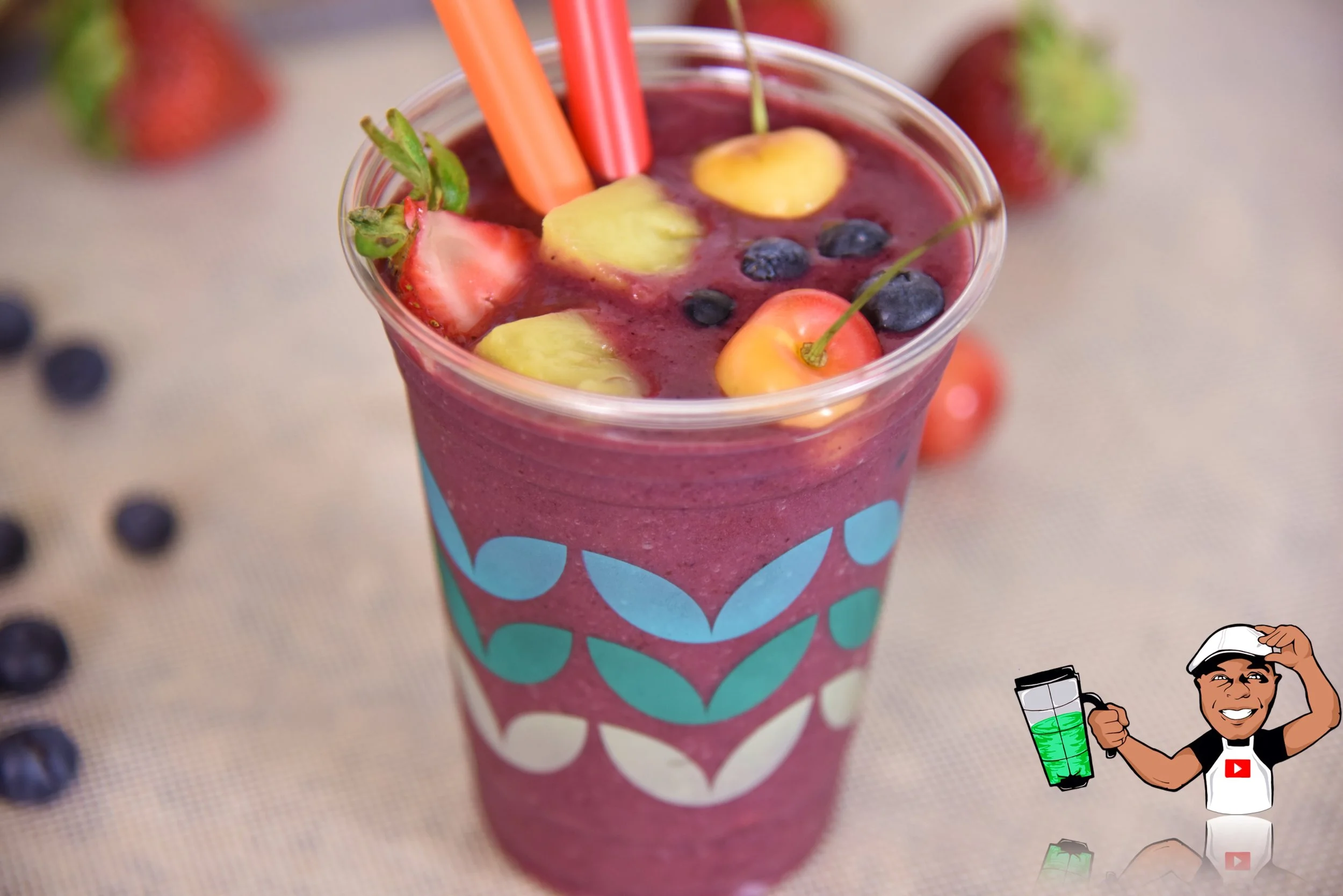 I RECOMMEND USING SOME OF THE INGREDIENTS IN THE SMOOTHIE TO GIVE YOUR GUESTS AN IDEA OF WHAT IS INSIDE THE SMOOTHIE. ADD FRESH FRUIT OF STRAWBERRIES, BLUEBERRIES, CHERRIES AND PINEAPPLE.